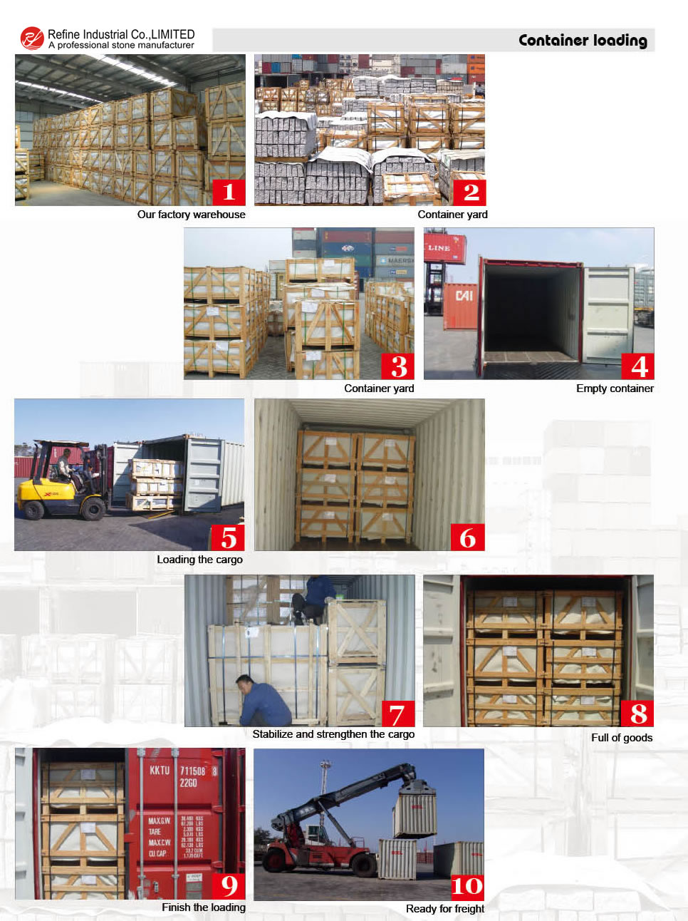 As a last step in the exportation of our goods, for each shipment, we will have the special staff go to the container yard and watch the goods successfully loaded into the containers. They will instruct the dockworkers how to load some special crates and teach them to strengthen the loading on the spot. They will take the pictures of the container loading. Our salesperson will email such loading photos to the customers and let them know everything is in good order. For gangsaw slabs, we may load the goods at the workshop of our factory, because the factory is well equipped with loading & unloading tools/machines. For other products, we will have the goods loaded at the container yard.
